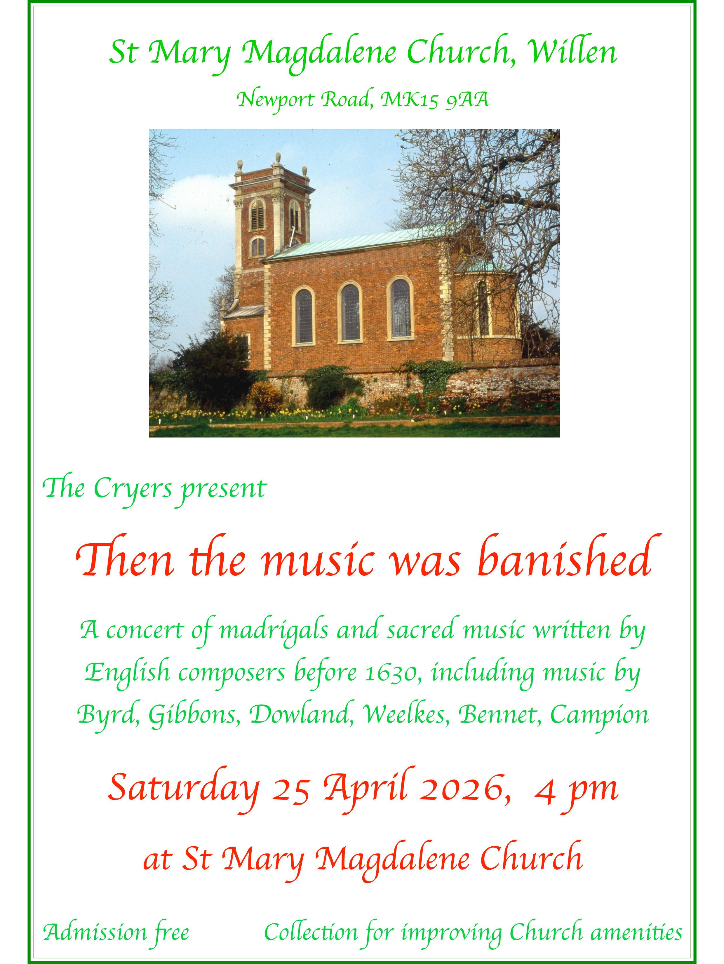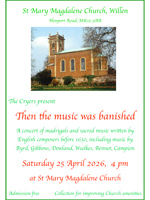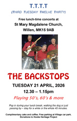 Concerts and Events 2026 TTTT Third Tuesday at Twelve Thirty 21st April - the Backstops The Cryers Saturday 25th April - 4pm